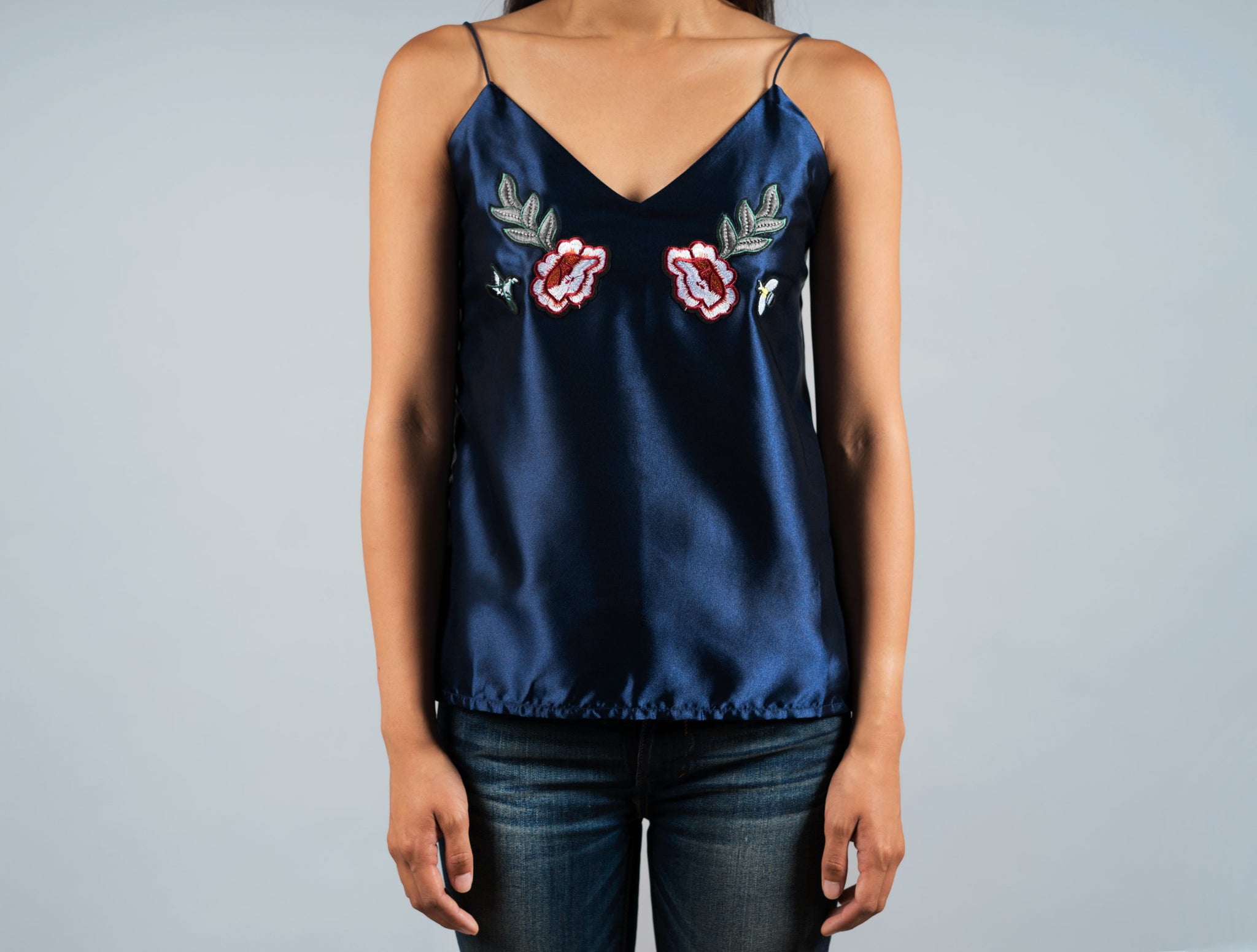 A sweet satin tank top with flowers embroidered across the chest. Paired with jeans, this is the perfect combo of sexy and casual.